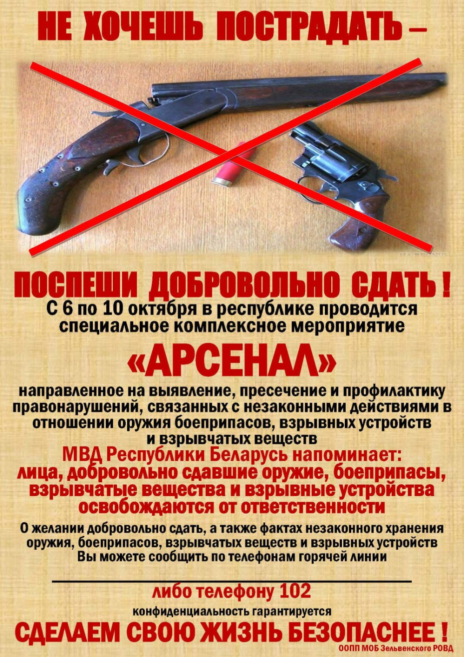 Главная цель проведения СКМ «Арсенал» - противодействие преступному обороту оружия, боеприпасов, взрывных устройств и взрывчатых веществ. Сотрудники органов внутренних дел особое внимание будут уделять выявлению лиц, хранящих оружие и боеприпасы без необходимого на то разрешения. Вместе с тем и не останется в стороне проведение рейдовых мероприятий с участием сотрудников инспекции охраны животного и растительного мира, иными природоохранными организациями по выявлению фактов незаконного использования охотничьего оружия.  У всех владельцев оружия будут проверены условия хранения по месту жительства зарегистрированного оружия и боеприпасов. В случае выявления нарушений хранения, а также незаконно хранящегося оружия и боеприпасов, со стороны сотрудников милиции будут приняты соответствующие меры реагирования. Также напоминаем, что лица, добровольно сдавшие незаконно хранящиеся оружие, боеприпасы, взрывные устройства и взрывчатые вещества, освобождаются от ответственности. Если вам известны факты незаконного хранения оружия и боеприпасов, изготовления, сбыта оружия, взрывчатых веществ, Вы можете сообщить на линию 102, либо по номеру телефона 7-15-94. Анонимность гарантируем!   Участковый инспектор милиции ООПП МОБ Зельвенского РОВД лейтенант  милиции Хихол В.А.